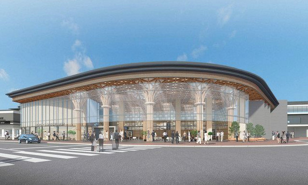 新幹線駅や在来線駅舎に隣接して建設が予定されている「賑わい施設」のイメージ。左側が「カフェレストラン・物販店舗」のスペース