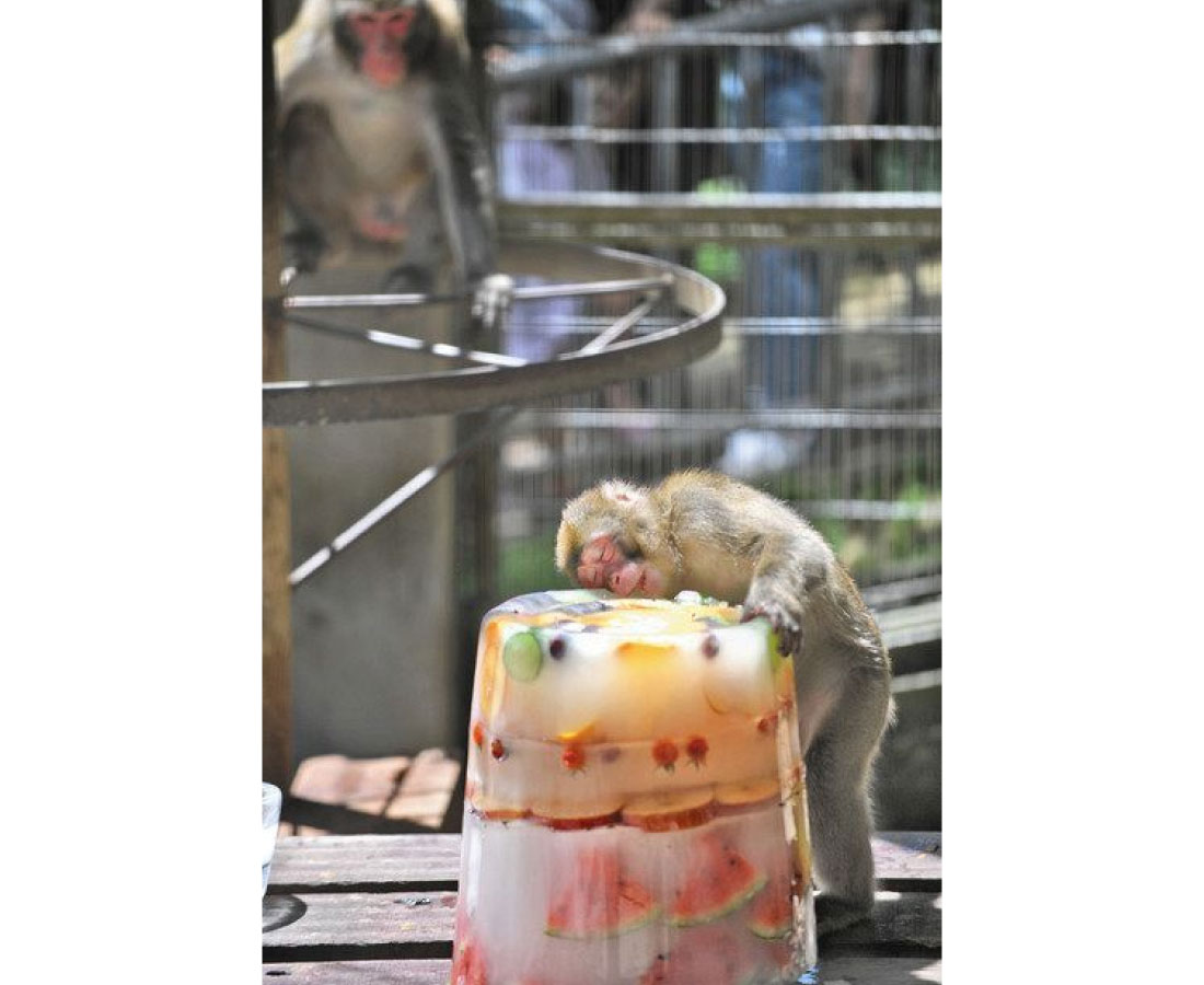 坂井市春江で八月の観測史上最高となる三七・五度を記録し、県内五観測所で三七度を上回る猛暑となった十日、福井市足羽山公園遊園地にあるニホンザルのサル舎では、果物や野菜が固められた大きな氷のケーキが登場した。