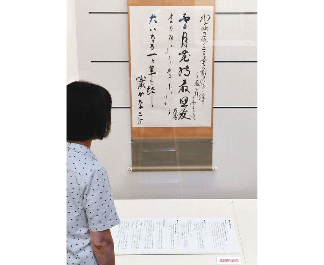 福井市の県ふるさと文学館は福井ゆかりの作家、高見順や日本人初のノーベル文学賞作家、川端康成らによる寄せ書きの掛け軸を公開している。九月二十二日まで。