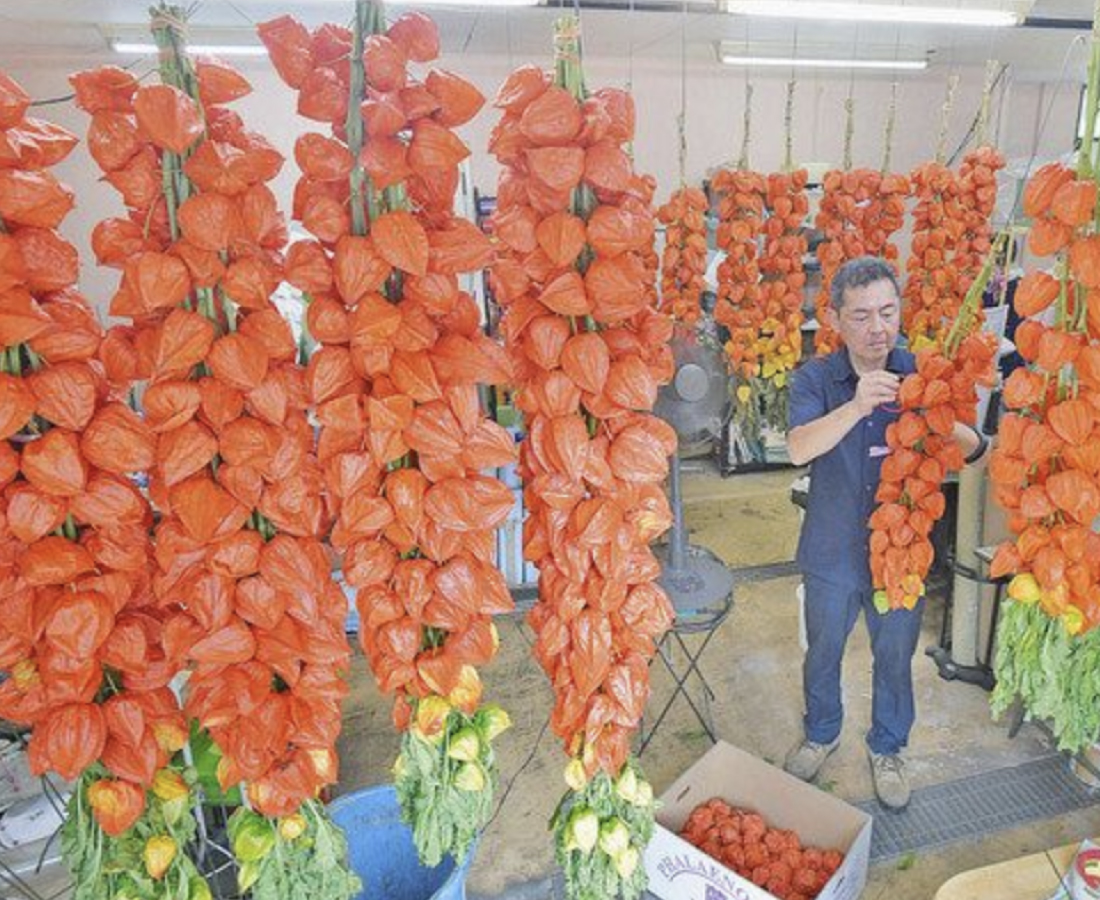 福井市照手一の「珍花園」で、旧盆に飾られるホオズキの乾燥作業が進んでいる。店内にカーテンのようにつり下げられ、扇風機の優しい風に揺られていた。ホオズキの朱色は鬼が嫌う色とされ、厄よけとして家の「鬼門」の方角に飾られる。