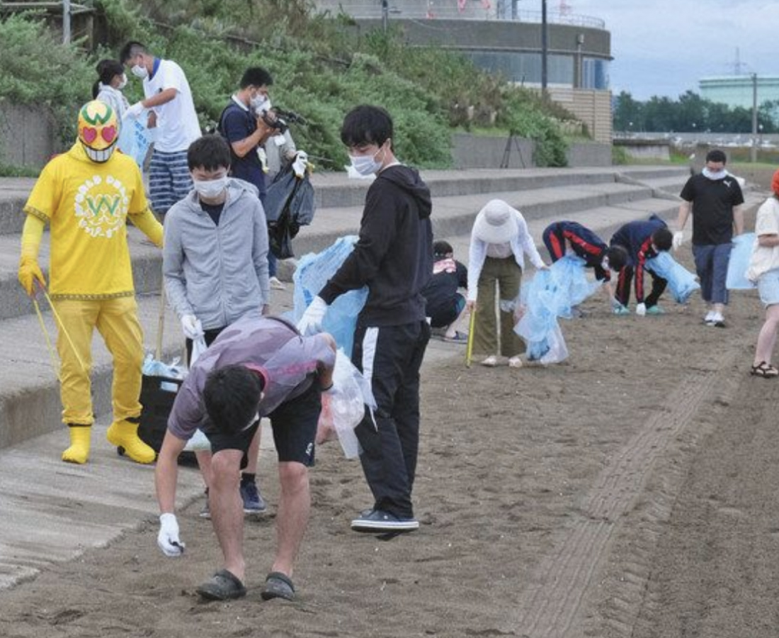 坂井市在住のご当地アイドルヒーロー「はっぴーすマン」と、その呼び掛けに応じた人たちが十二日、市内の三国サンセットビーチで清掃活動をした。