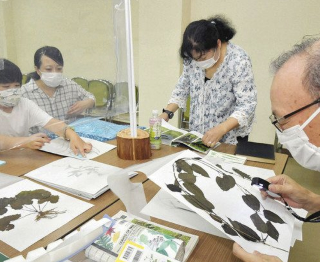 坂井市の県総合グリーンセンターは十三日、夏休み自由研究の応援企画「植物標本の名前を調べよう」を開いた。小中学生とその保護者の八組の申し込みがあった。福井市の樹木医橋本哲夫さん(69)と、元福井市自然史博物館長の渡辺定路さん(87)が講師を務め、持ち込まれた標本を前に、必要に応じて何種類もの植物図鑑を参照したり、一時的にフェースシールドを外してルーペで葉の特徴を丹念に観察したりしていた。