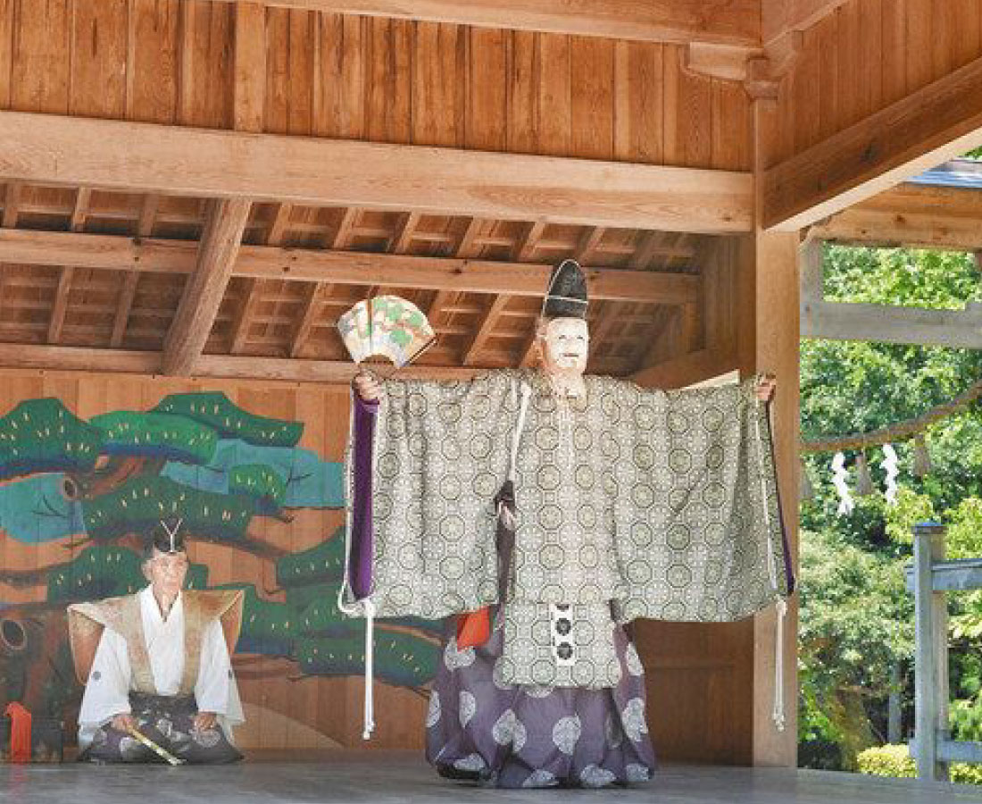 美浜町宮代の弥美神社で二十日、五穀豊穣(ごこくほうじょう)を願う神事能「風祈能(かざいのう)」が営まれ、県の無形民俗文化財に指定されている神歌「一人翁」が奉納された。