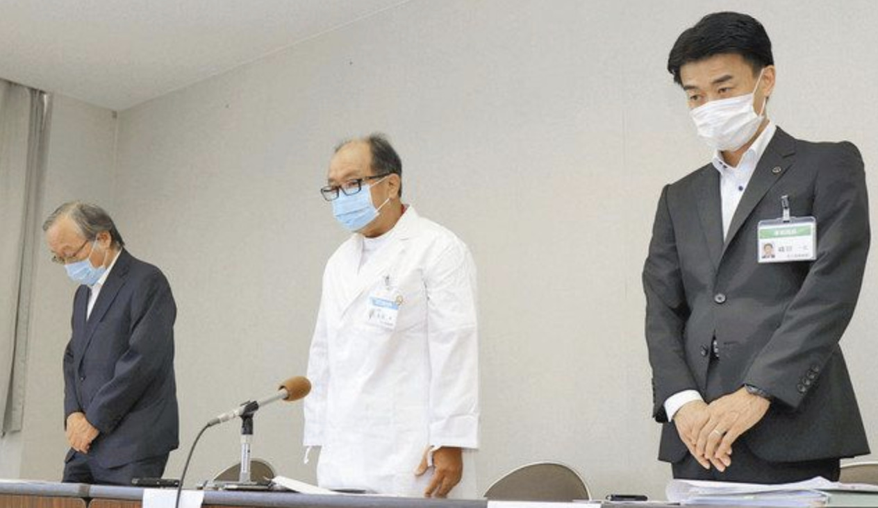 医療事故について謝罪する太田院長(中)ら=25日、敦賀市の市立敦賀病院で
