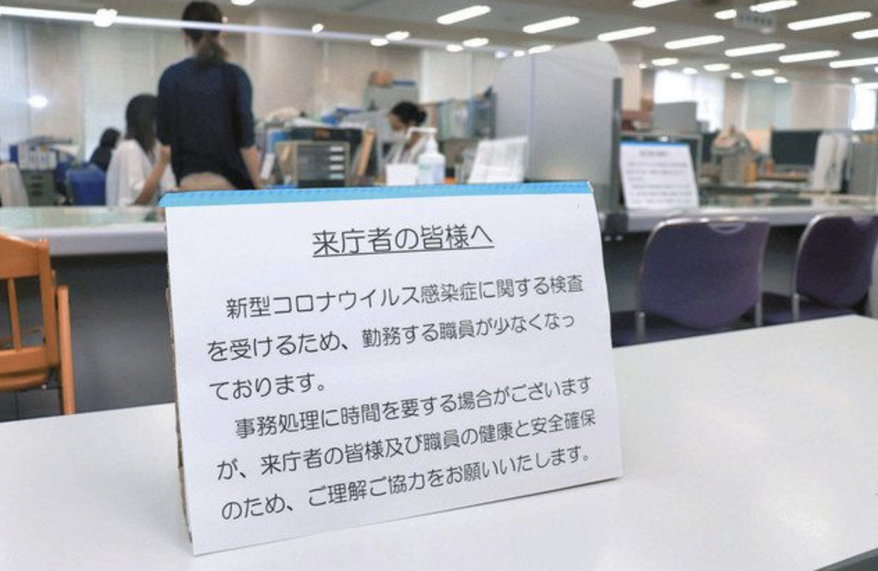 PCR検査を受けるため勤務する職員が少なくなっている敦賀市役所=25日、同市役所で