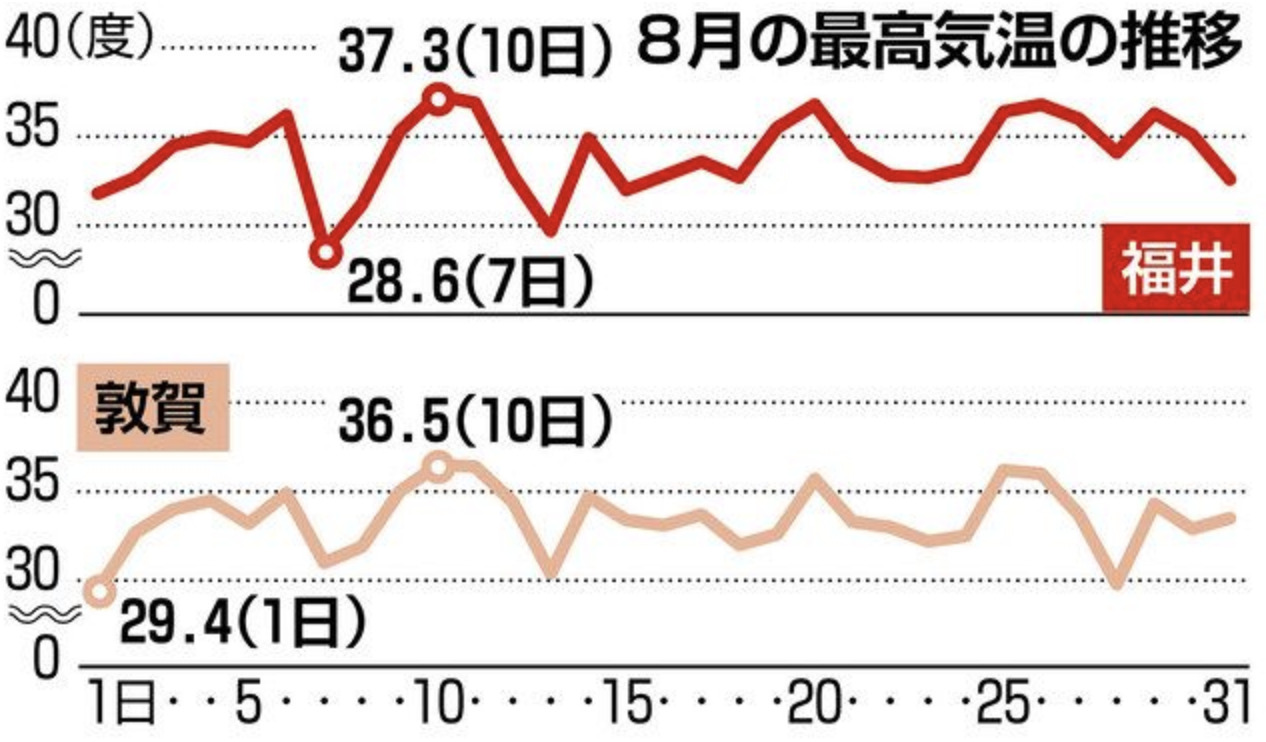 8月の平均気温 福井 29.0度 敦賀 29.2度福井地方気象台などによると、八月の県内は平均気温が福井で二九・〇度、敦賀で二九・二度と、いずれも平年より一・八度も高く、八月の平均気温としては両観測地点とも過去三番目の高さとなった。最高気温が三五度以上となる猛暑日の日数も福井で十二日あり、平年(三・八日)を大きく上回った。八月の県内は強い日差しが照りつけ、厳しい暑さが続いた。(藤井雄次)