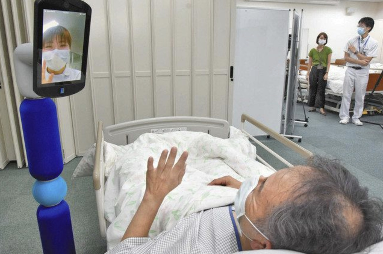 遠隔操作ロボットの画面を通して、医師らが患者に近づかなくても様子を見ることができる=福井市の県済生会病院で