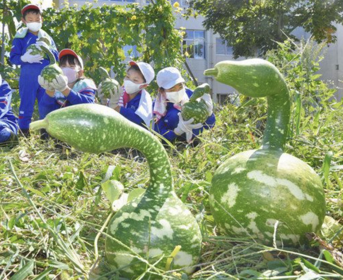 恐竜のような形が特徴のひょうたんを栽培している勝山市鹿谷小学校で十五日、収穫作業が行われた。草むらからヒョッコリ現れた“恐竜”たちを児童たちが捕まえていた。