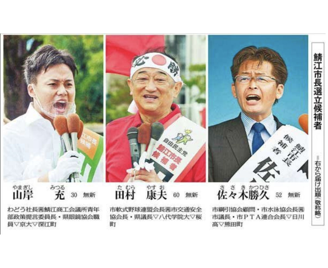 鯖江市長選が二十七日、告示された。いずれも無所属新人で、元市議の佐々木勝久(52)=熊田町、元県議の田村康夫(60)=桜町三、会社経営の山岸充(30)=深江町=の三氏が立候補を届け出た。三つどもえの選挙戦は、鯖江市制がスタートした一九五五(昭和三十)年以来六十五年ぶり。投票日は十月四日で即日開票される。(清兼千鶴、中場賢一、玉田能成)