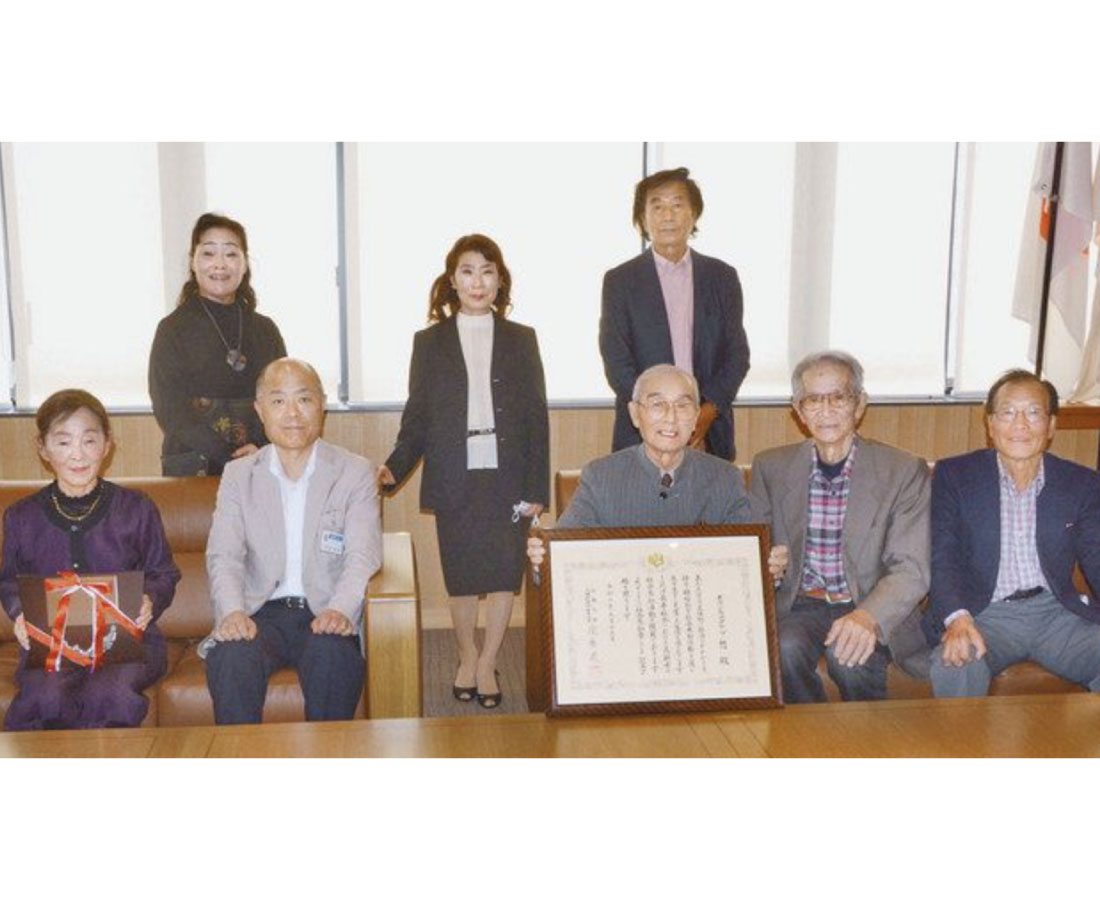 越前市の「ボランティアグループ憩」のメンバーが七日、市役所を訪れ、地域で社会参加活動を積極的に行う高齢者グループをたたえる内閣府の「社会参加章」の受章を、奈良俊幸市長に報告した。