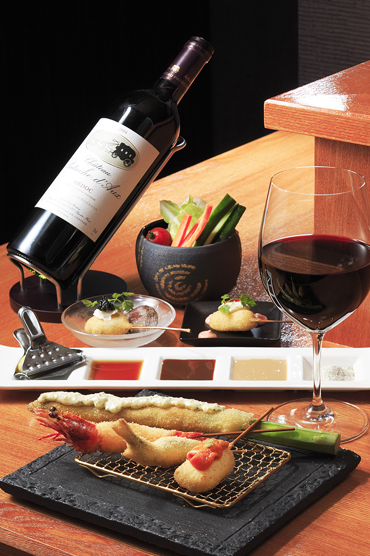 また、12年前の創業当時から、串揚げとワインのマリアージュを提案するこちらの店には、ソムリエがセレクトしたワインが豊富に揃い、スパークリング、白、赤、ロゼがあります。日本酒も地酒はもちろん、県外の知る人ぞ知る名酒もあり、ここでは常にひとつ上の贅沢が楽しめます。