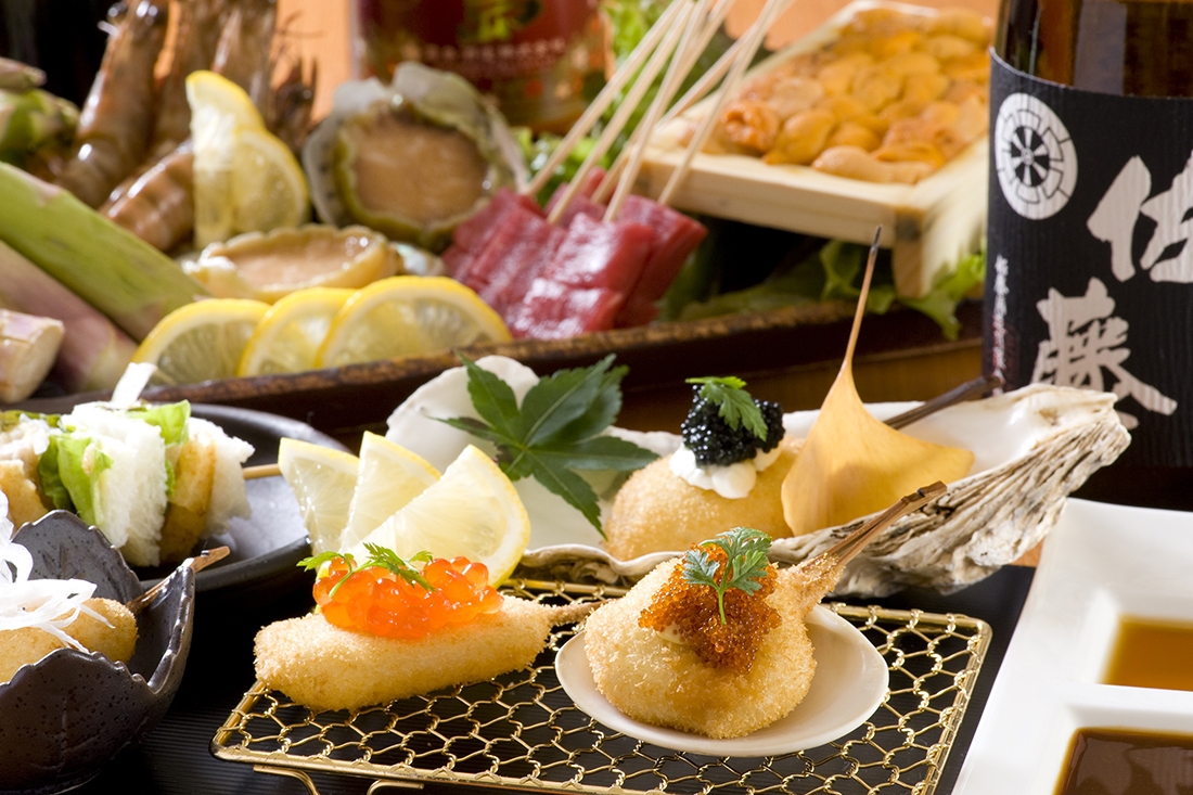 おススメはシェフの創意工夫に満ちた串揚げを存分に堪能できる「おまかせコース( 10種以上からの受付)」。自由な発想で組み合わせた素材のハーモニーに驚かされるひと串は、風味や食感など、さまざまな持ち味が重なり合い、今まで感じた事ない未体験の美味さを体験させてくれます。